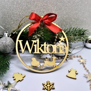 Bombka Drewniana zawieszka grawer "sanie z reniferem"