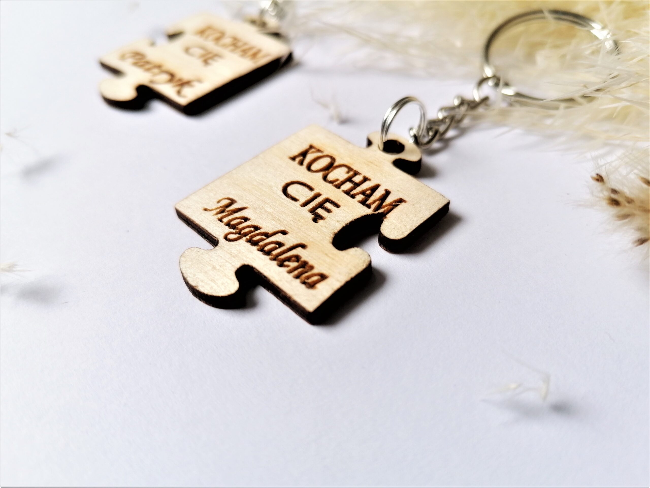 Zestaw dwóch pasujących do siebie breloczków w kształcie puzzli.