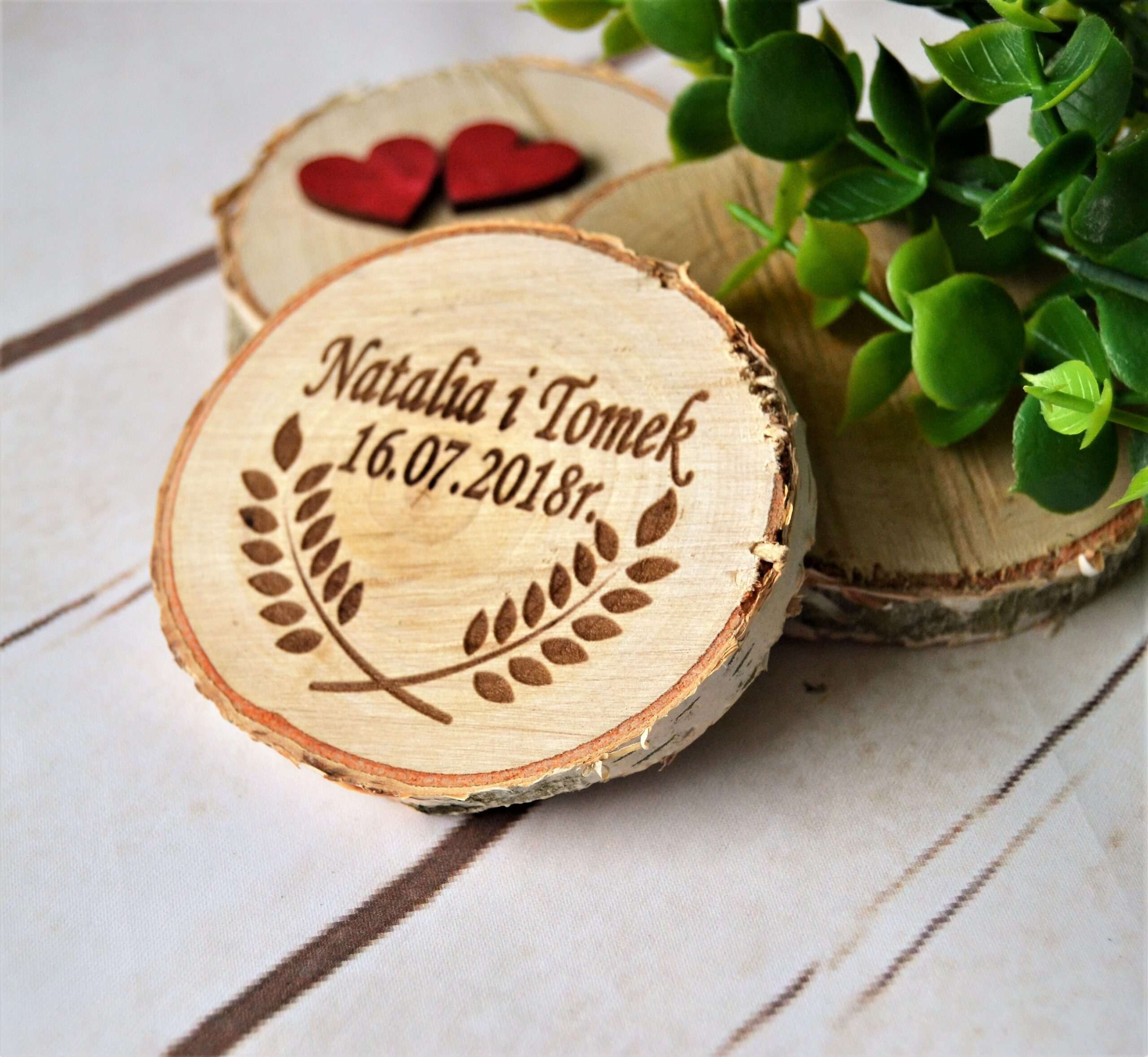 Prezentujemy wyjątkowe, rustykalne magnesy ślubne z wygrawerowanymi laserowo imionami Pary Młodej i datą uroczystości.Doskonale podkreślające naturalne piękno drewna, idealny jeśli planujesz wesele w stylu rustykalnym.