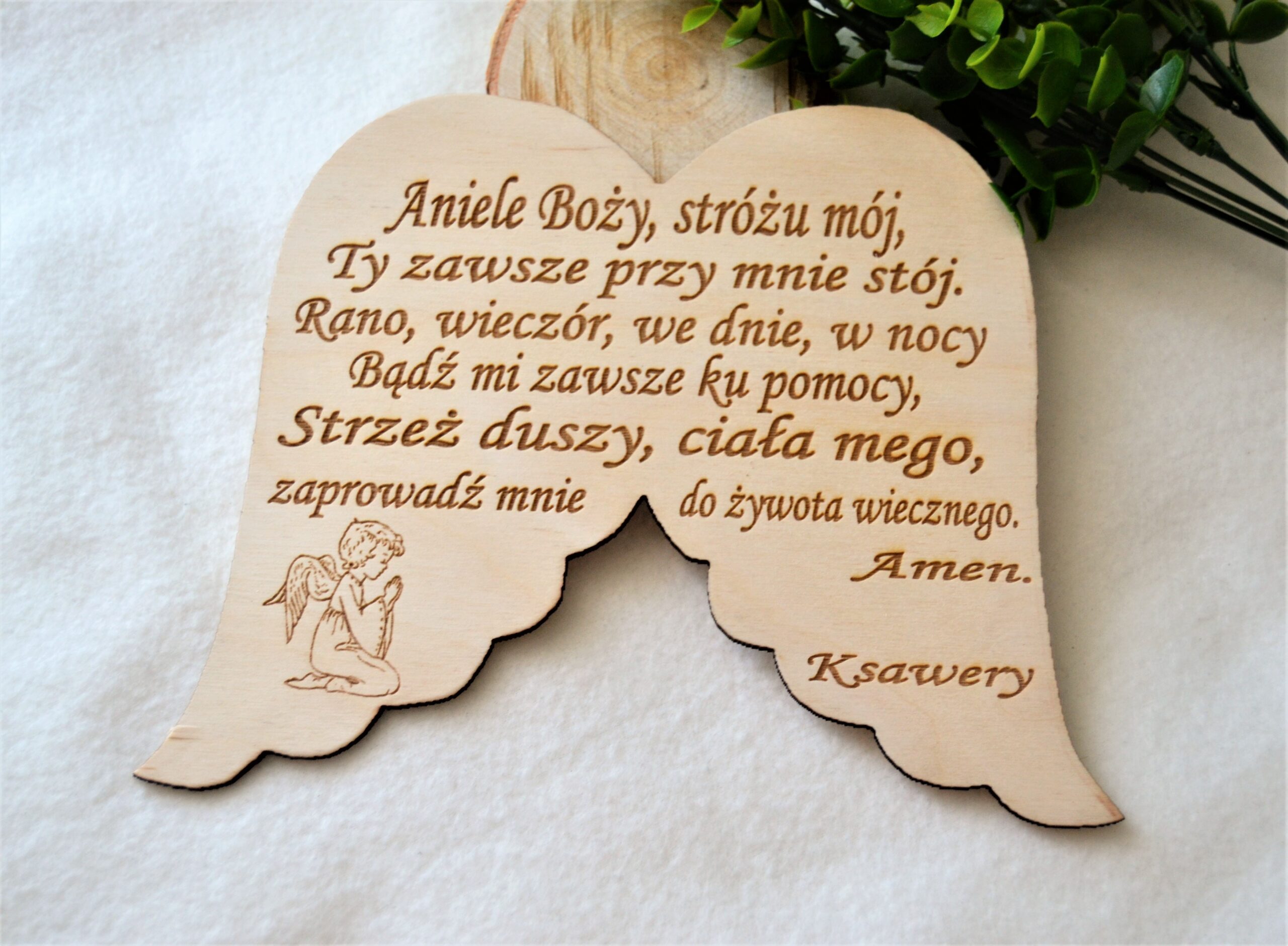 Pamiątka skrzydełka drewniane z modlitwą Aniele Boży