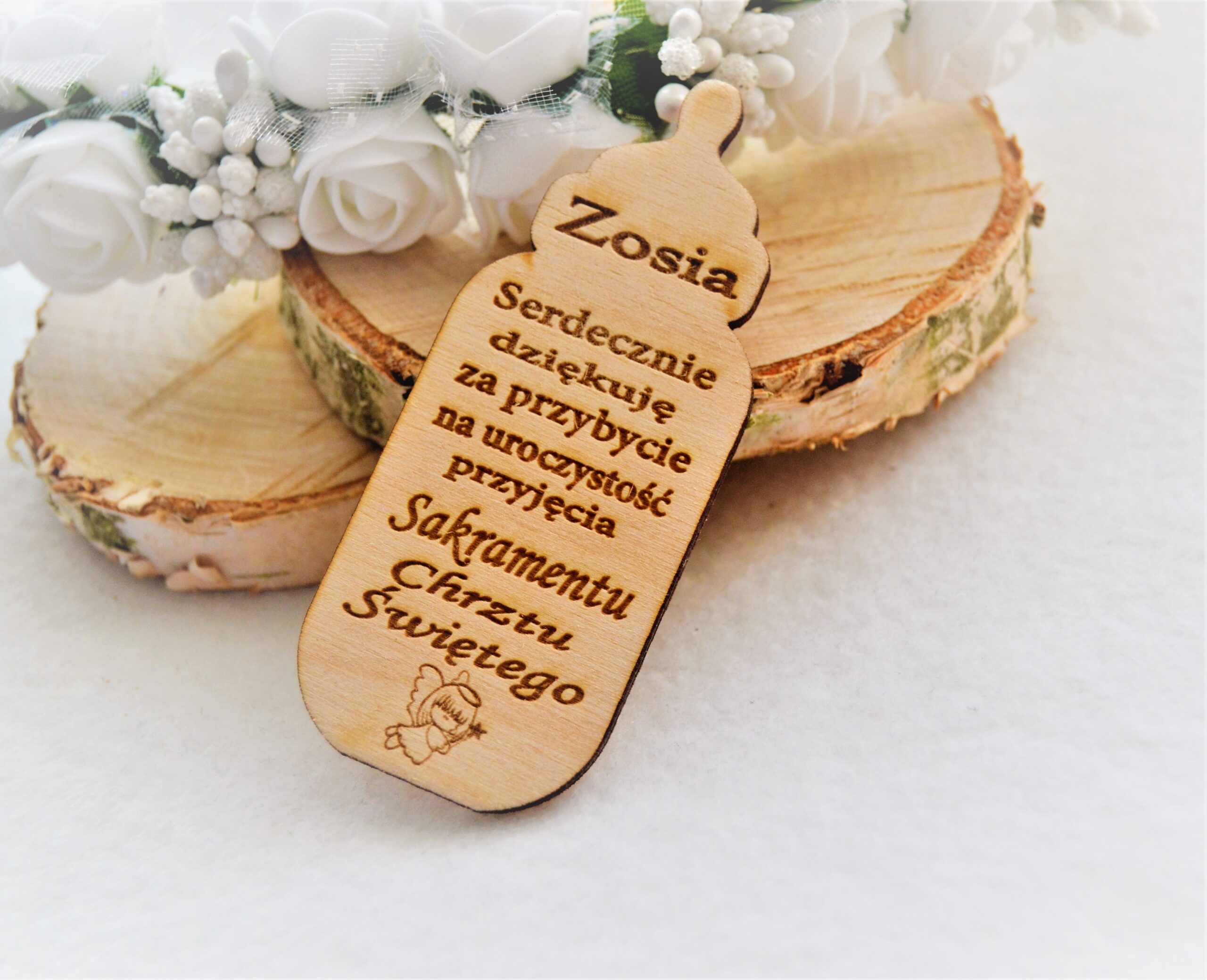 Podziękowanie gościom za przybycie na uroczystość Chrztu Świętego będzie bardzo miłym gestem . Drewniana buteleczka będzie przywoływać wspomnienia z tej uroczystej chwili w pamięci gości.