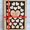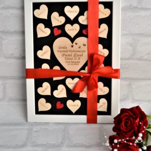 Ramka z drewnianymi serduszkami i grawerem.