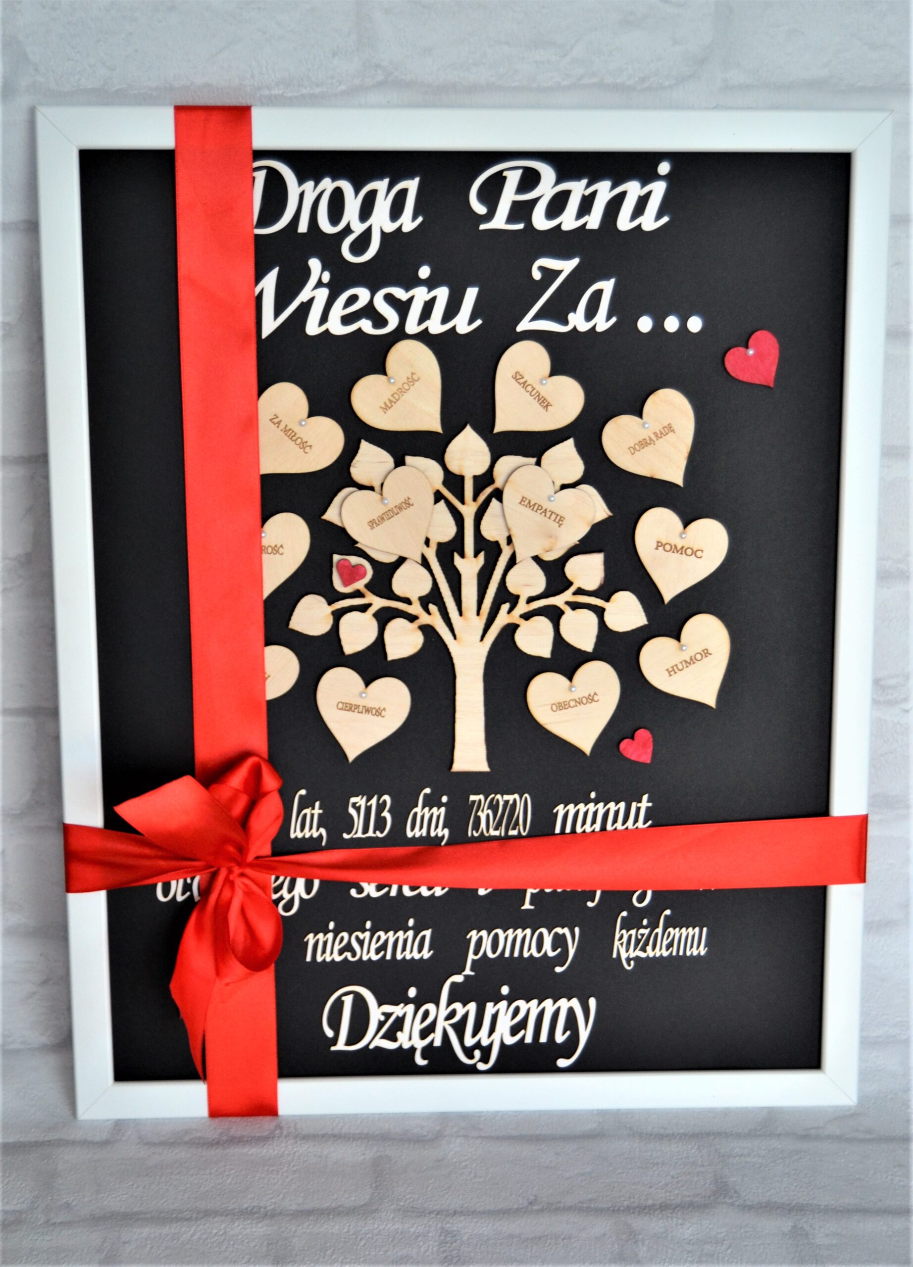 Ramka z drewnianymi serduszkami i grawerem.